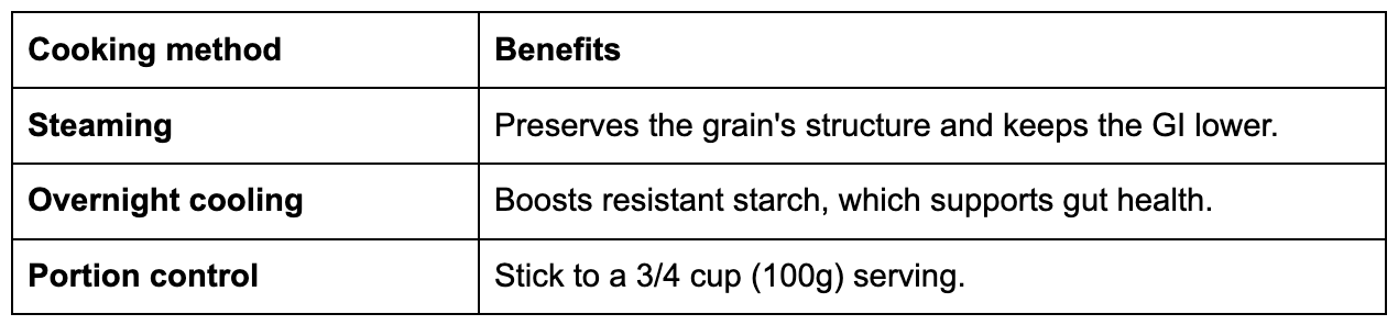 For leftovers, refrigerate cooked rice within two hours and consume within 24 hours to boost resistant starch, which may help reduce glycaemic impact even further.