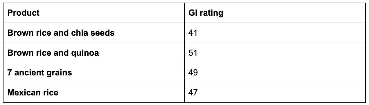 Coles Brown Rice comes in several low GI options. For example, the brown rice and chia seed blend has a GI of 41-68, making it one of the lower GI selections available in Australian supermarkets.