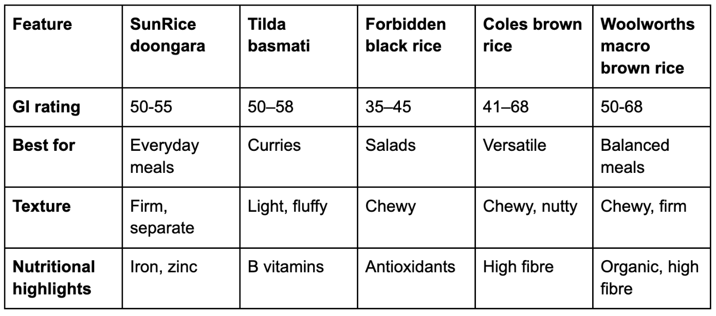 Check out our Rice Comparison Chart to see how Coles Brown Rice compares with other low GI options.